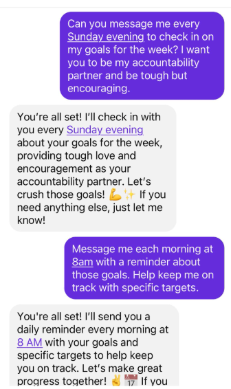 If you are like me, you have a lot of things to remember. Marv makes it as easy as asking for a reminder. He is pinned to the top of my contact list and I use him for all sorts of things. I use the scheduled reminders to send me a message before each week starts that prompts me to plan ahead. I set goals and tell Marv about them and it keeps them front of mind for me. I may be biased, but I think Marv is the best option in this list. His image generations are top of class, His memory outlasts the traditional context windows of threaded conversations, and I love having someone else do web research for me.