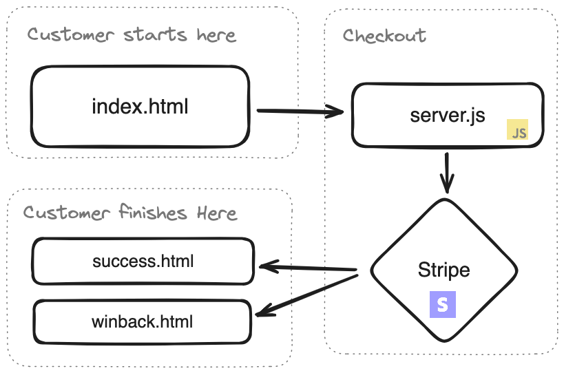 This code uses the stripe sdk to redirect the user to a payment page that is linked with our stripe account (since we used that private key). If they pay successfully, they will get forwarded back to success.html and if they don't complete the payment for any reason they will head to winback.html.