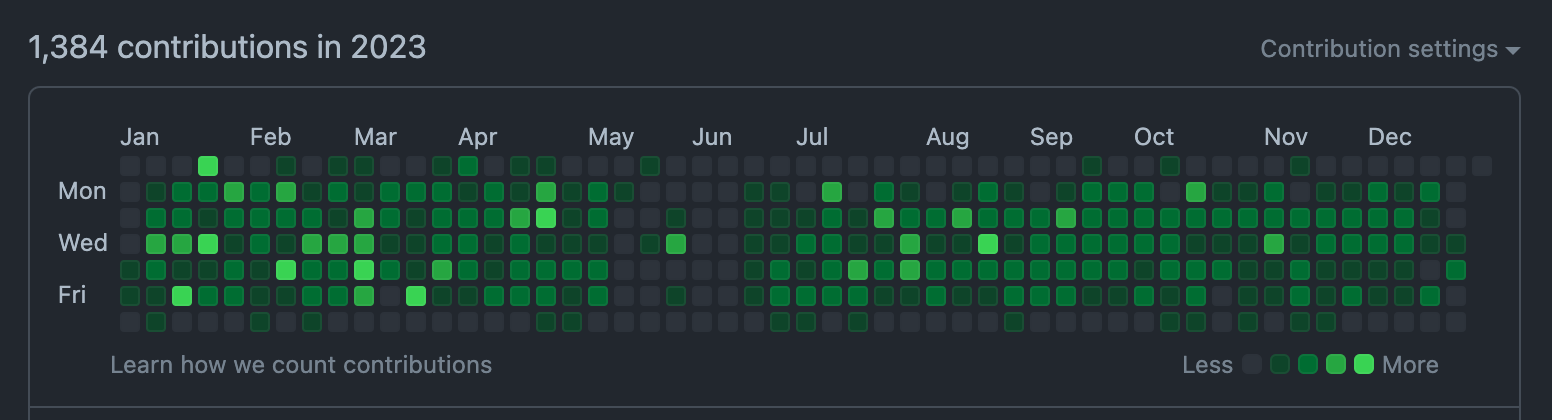 That two week gap in 2023 is my wedding / honeymoon. I went to Costa Rica and completely unplugged for the first time in years. During the two weeks after I came back, I wrote the best code of my whole tenure. Rest is important.